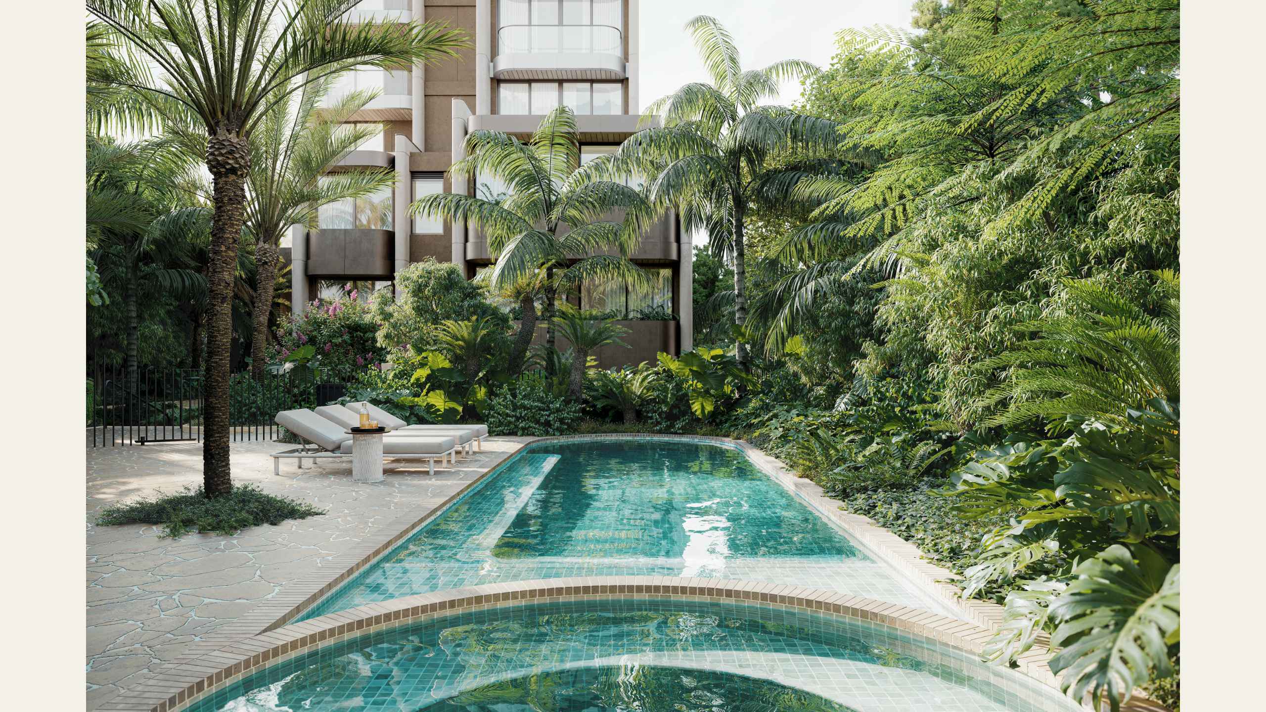 Reminiscent of an exotic sun-soaked resort, Margaux’s pool and spa shape a beautiful outdoor venue to ease into the day with laps or cool down on a hot summer day. This lush oasis peppered with towering fern trees is an open invitation for family and friends to while away a sunny weekend. Beautifully furnished cabanas are the perfect retreat for poolside relaxation, your luxury escape without leaving the comforts of home.